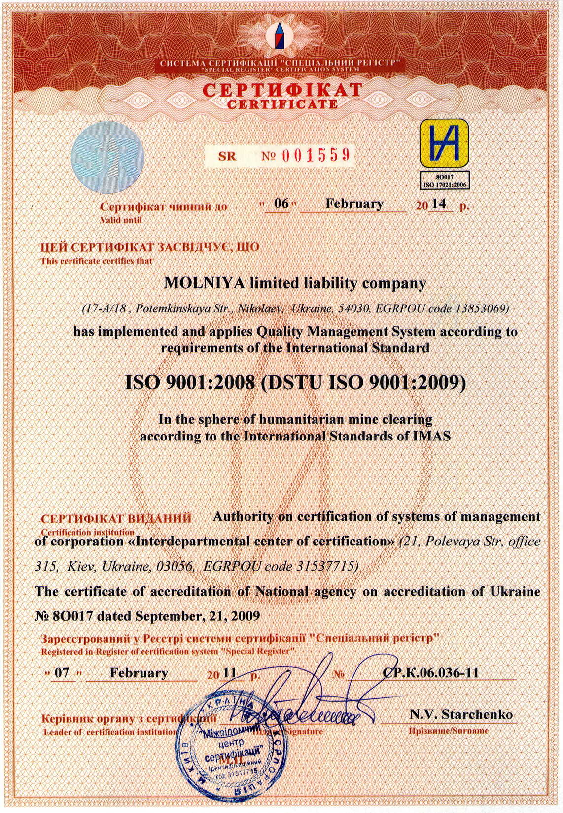С февраля. 2011 г. по февраль 2014 г. предприятие производило работы по гуманитарному разминированию территорий. Имеет международный Сертификат ISO 9001:2008 (DSTU ISO 9001:2009) SR № 001559 от 07.02.2011 г.