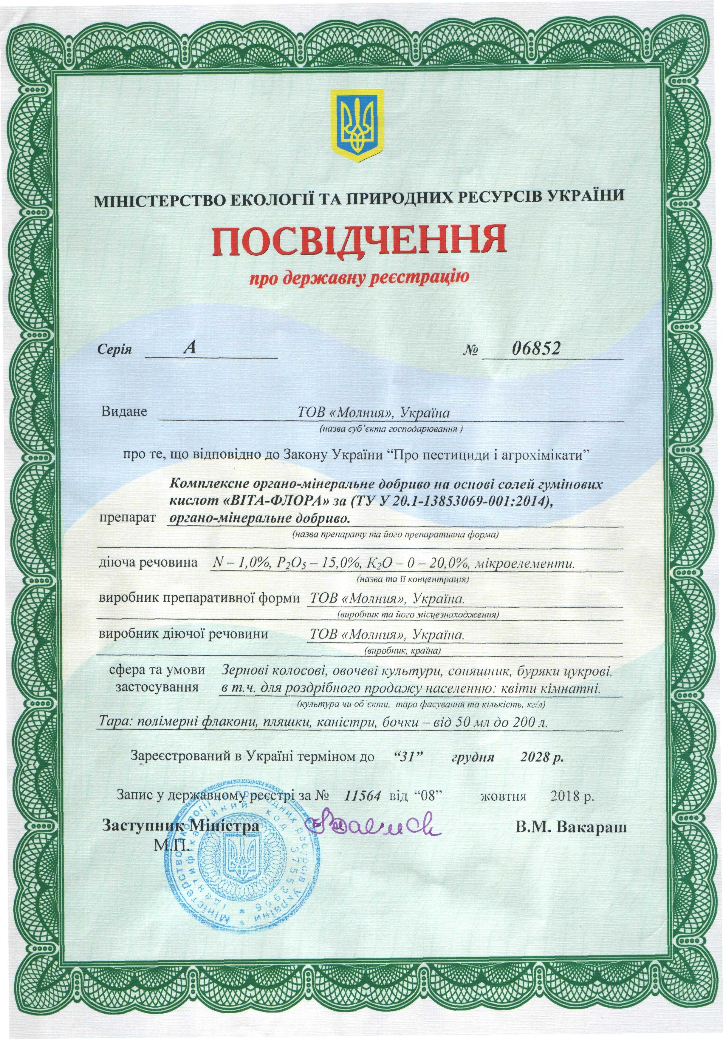 В 2014 г. предприятием разработан препарат - «Комплексное органо-минеральное удобрение на основе солей гуминовых кислот «Вита-Флора», который является основой для создания целой гаммы рострегулирующих, иммуномодулирующих и стресс корректирующих добавок к минеральным и органическим удобрениям. Получено “Посвідчення про державну реєстрацію” серия А № 06852 сроком действия до 31.12 2028 г. Препарат зарегистрирован в Эстонии 09.10.2018 регистрационный № 1322.